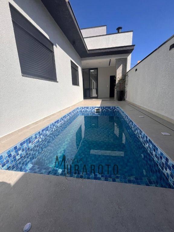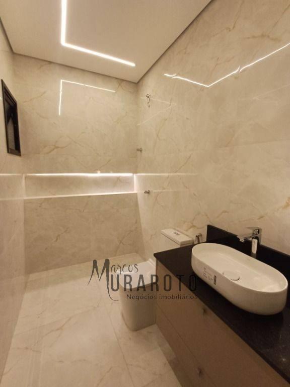 A fachada contemporânea abriga uma bela arquitetura e moderna distribuição que internamente apresenta detalhes como: bancadas da cozinha em São Gabriel, lavatórios em mármore nos banheiros, churrasqueira a carvão, amplo quintal com espaço gourmet, sonorização neste espaço, iluminação em fita de LED, portas brancas e esquadrias pretas na linha suprema com persianas integradas nas janelas, porta de entrada com fechadura digital, brise de alumínio na fachada, piscina aquecida com 4 pontos de hidromassagem e jardim com irrigação automática. A casa é toda revestida em porcelanato.